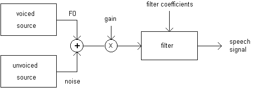 Another widely used method to produce synthetic speech is formant synthesis which is based on the source-filter-model of speech production described in Figure 1.2 below. The method is sometimes called terminal analogy because it models only the sound source and the formant frequencies, not any physical characteristics of the vocal tract (Flanagan 1972). The excitation signal could be either voiced with fundamental frequency (F0) or unvoiced noise. A mixed excitation of these two may also be used for voiced consonants and some aspiration sounds. The excitation is then gained and filtered with a vocal tract filter which is constructed of resonators similar to the formants of natural speech.