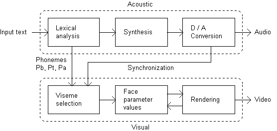 The speech synthesizer and the facial animation are usually two different systems and they must be synchronized somehow. If the synchronization process is not done properly, the quality and intelligibility of audiovisual speech may even decrease significantly. Usually, the speech synthesizer is used to provide the information for controlling the visual part. The computational requirements for the visual part are usually considerably higher than for the audio, so some kind of feedback from the visual part may be needed to avoid lag between audio and video. The lag may be avoided by buffering the audio images and adjusting the frame rate if necessary. The structure of an audiovisual speech synthesizer is presented in Figure 8.1.